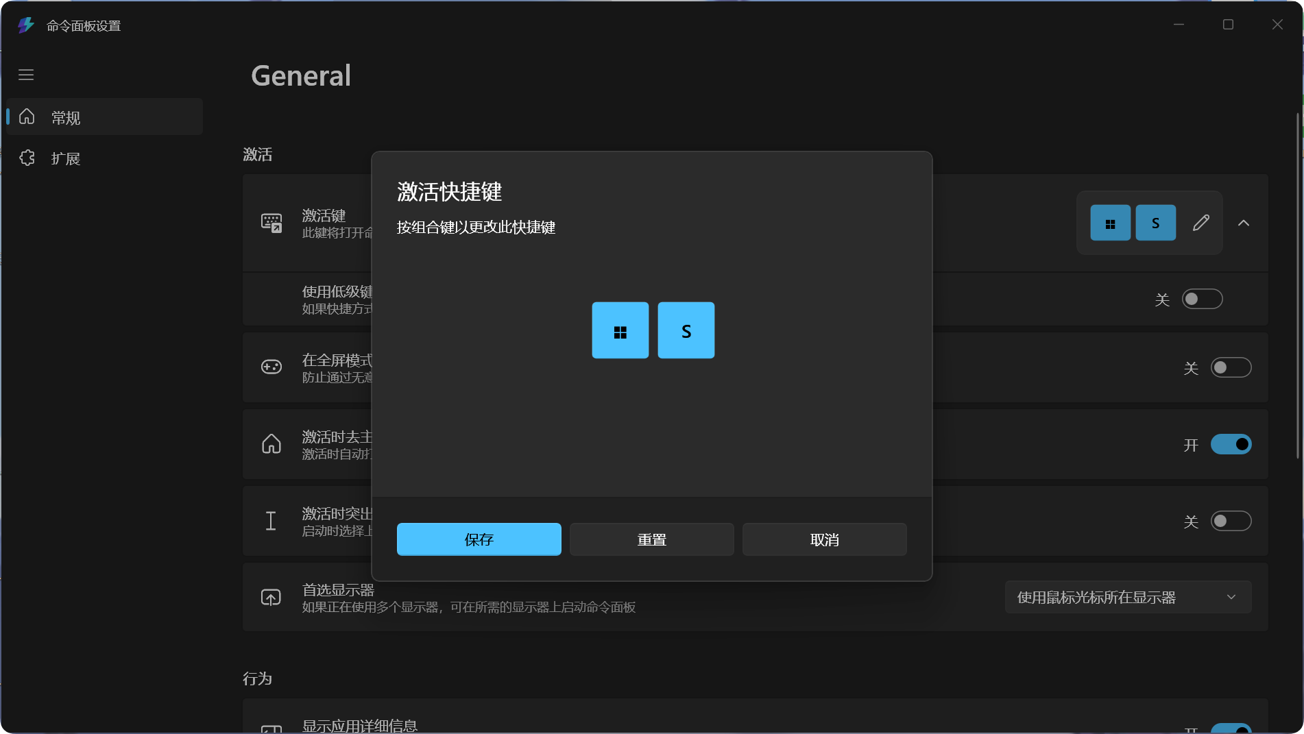 在这里我们可以修改触发命令面板的快捷键,配置一些拓展,甚至关掉托盘图标