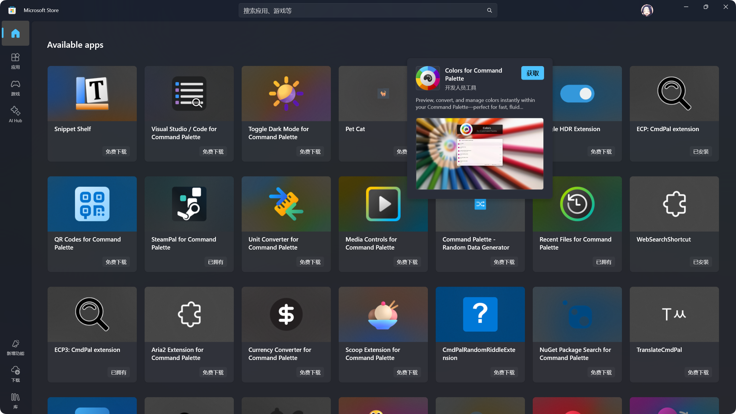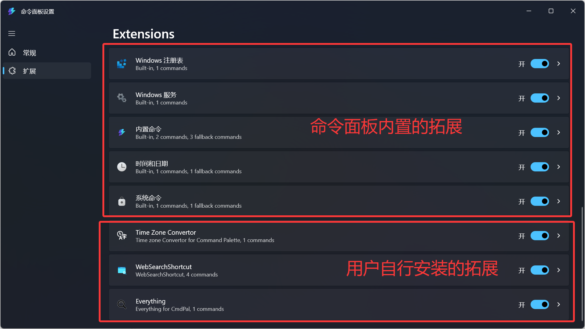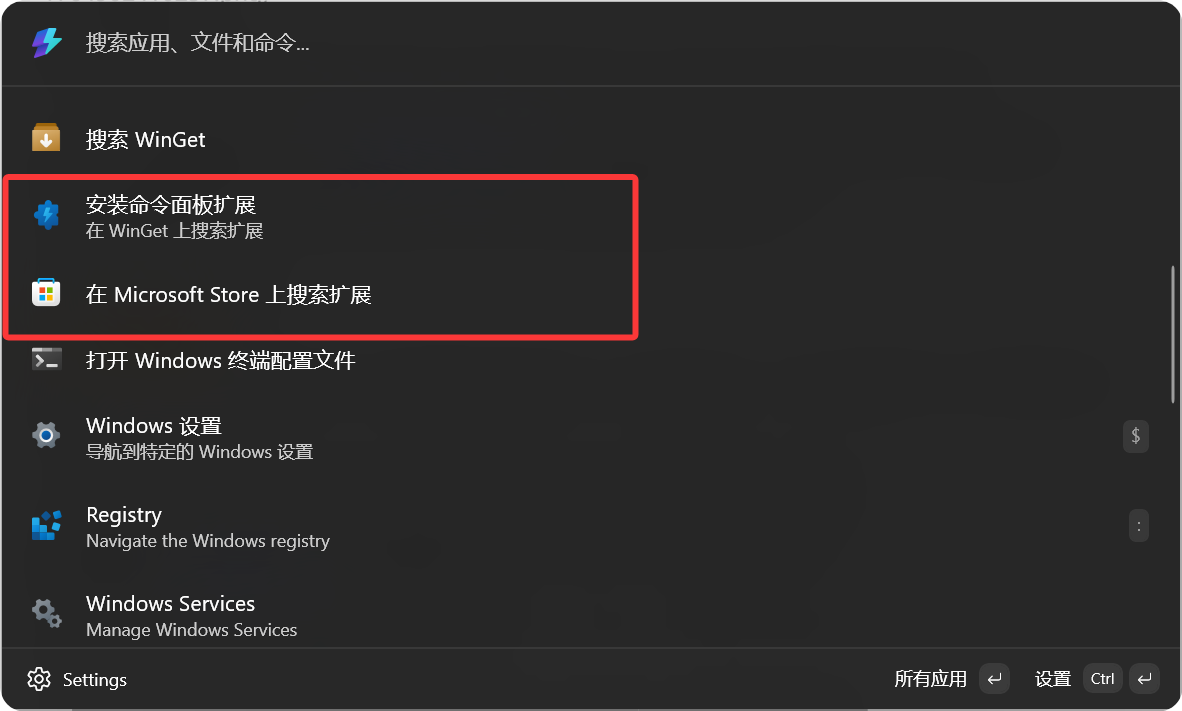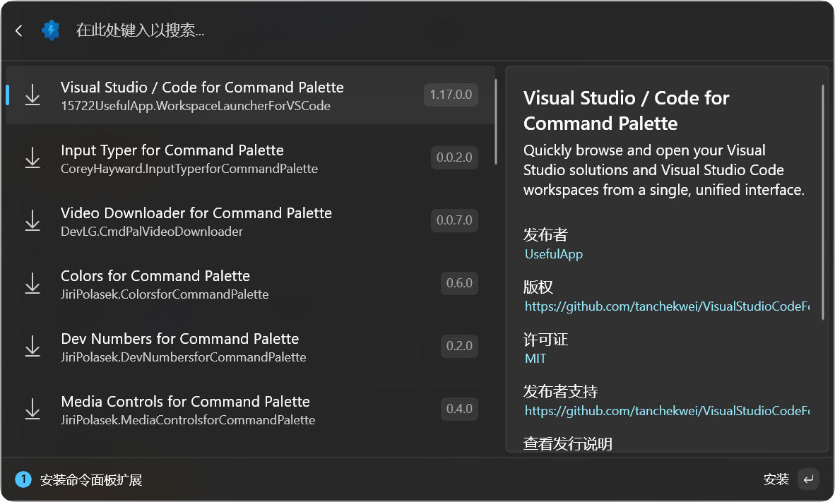 命令面板由PowerToys Run演变而来,自然也就支持拓展功能,只不过安装拓展的方法更加简单: